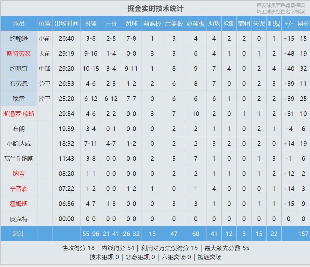 掘金两个首发缺阵:阿隆-戈登和佩顿-沃特森都没打。本赛季掘金场均120.9分,高居联盟第一;进攻效率123.8,同样是联盟第一;投篮命中率49.6%,联盟第二;三分命中率39.6%,联盟第一;场均罚球命中数21.1,联盟第二。