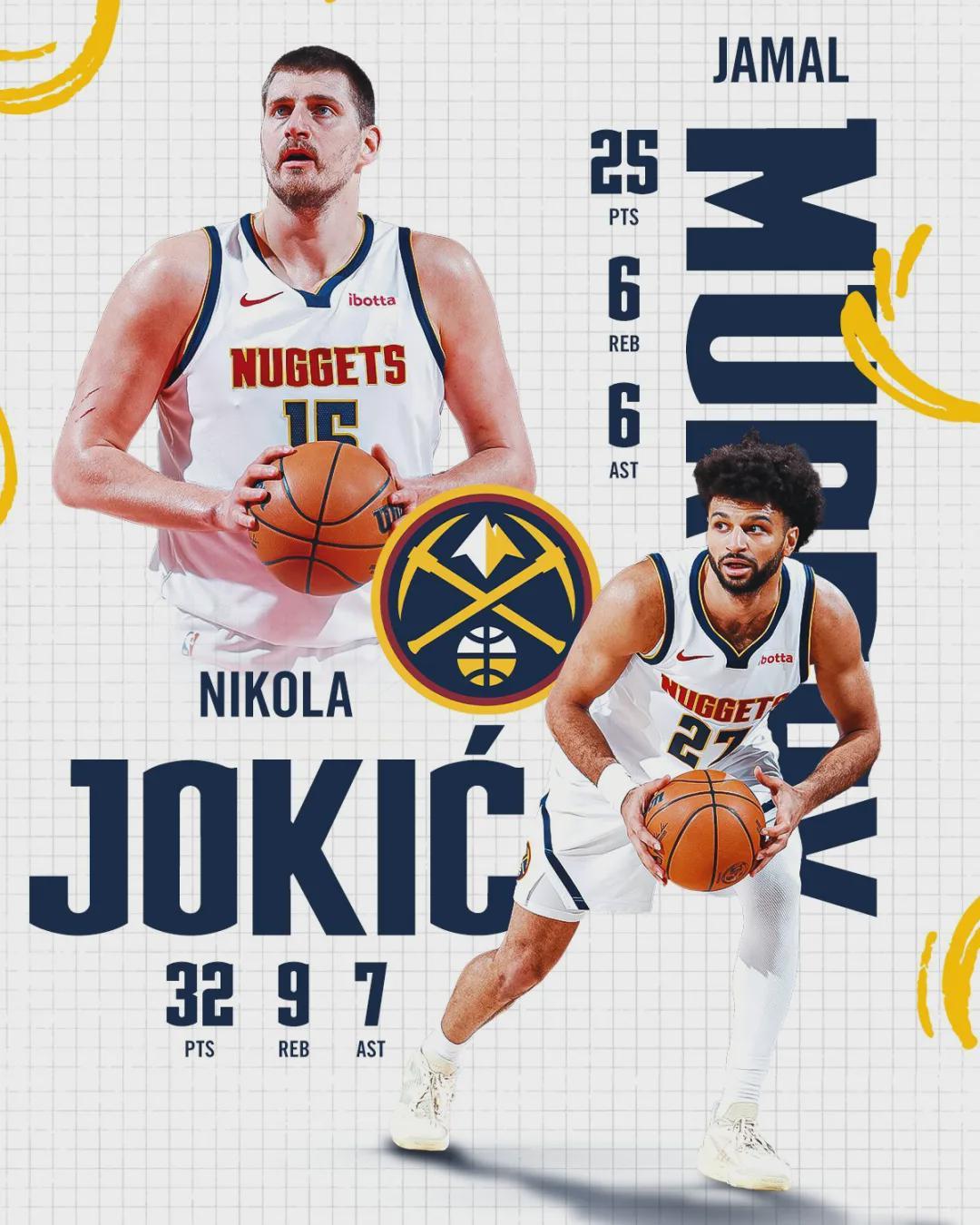 此役阿夫迪亚投篮10中5,三分4中0,罚球7中5,得到15分8篮板13助攻6失误,正负值-30。约基奇打了29分钟,投篮15中10,三分4中3,罚球11中9,狂砍32分9篮板7助攻4抢断,正负值+40。其中正负值追平约老师生涯纪录!