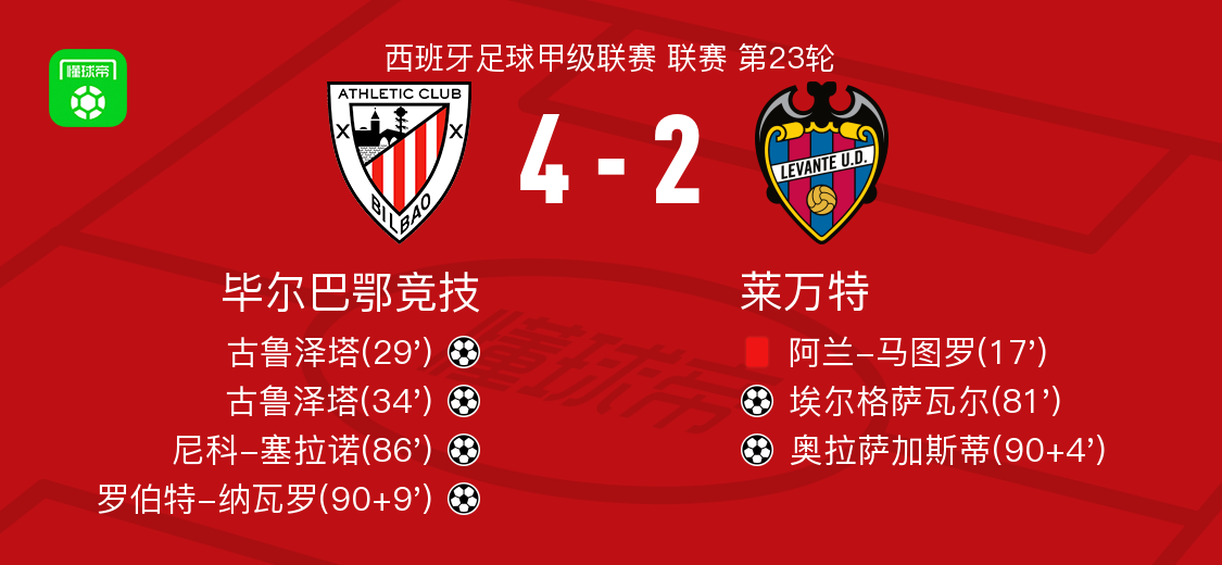 北京时间2月8日西班牙足球甲级联赛 联赛 第23轮,毕尔巴鄂竞技主场对阵莱万特。毕尔巴鄂竞技古鲁泽塔梅开二度,尼科-塞拉诺破门,罗伯特-纳瓦罗破门。莱万特埃尔格萨瓦尔破门,奥拉萨加斯蒂破门。最终比分毕尔巴鄂竞技 4-2 莱万特。
