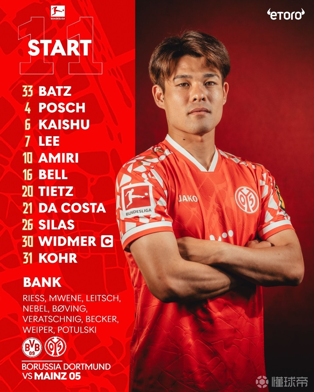 美因茨首发:33-巴茨、31-多米尼克-科尔、30-西尔万-威德默、21-丹尼-达科斯塔、16-斯特凡-贝尔、4-斯特凡-波施、10-阿米里、6-佐野海舟、7-李在城、26-姆武帕、20-蒂茨