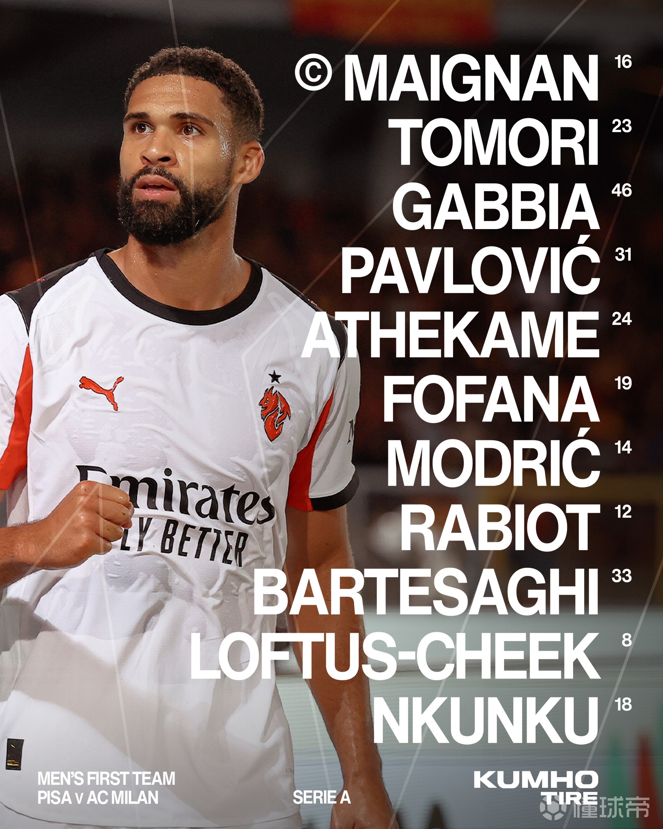 米兰首发:16-迈尼昂、23-托莫里、46-加比亚、31-帕夫洛维奇、24-阿特卡梅、19-优素福-福法纳、14-莫德里奇、12-拉比奥、33-巴尔泰萨吉、8-洛夫图斯-奇克、18-恩昆库