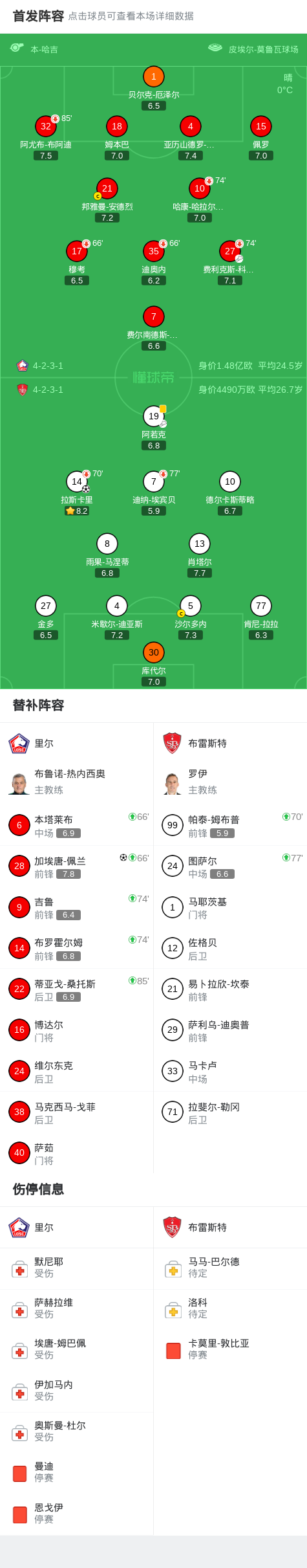 北京时间2月15日法国足球顶级联赛 联赛 第22轮,里尔主场对阵布雷斯特。里尔加埃唐-佩兰破门。布雷斯特拉斯卡里破门。最终比分里尔 1-1 布雷斯特。