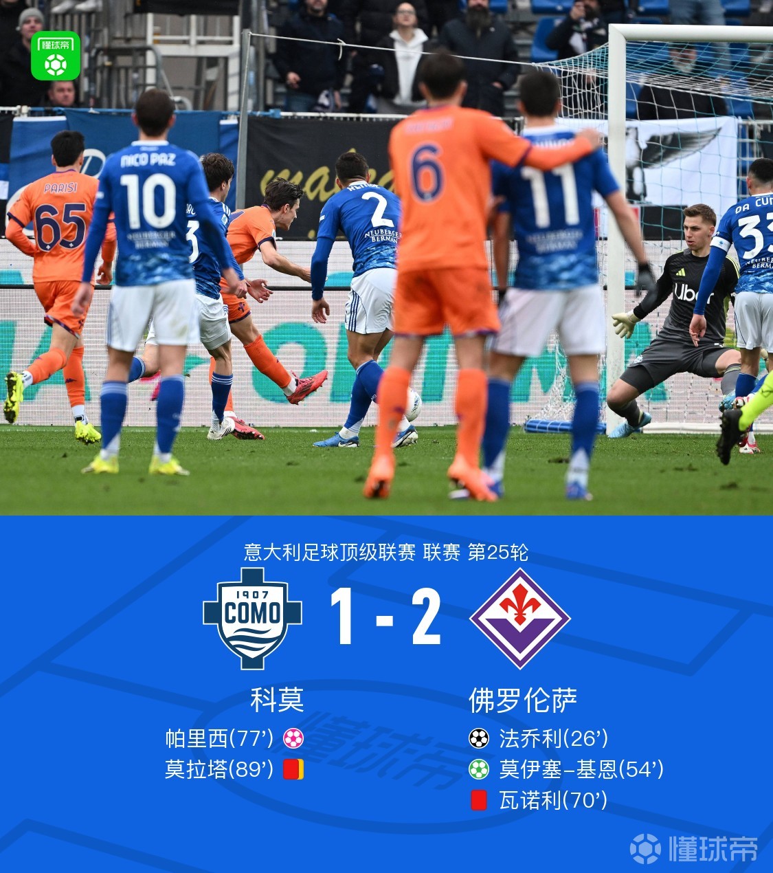 北京时间2月14日意大利足球顶级联赛第25轮,科莫主场对阵佛罗伦萨。佛罗伦萨法乔利率先破门,随后莫伊塞-基恩点球破门,帕里西自摆乌龙,比赛最后阶段,莫拉塔抱怨裁判连吃两黄被红牌罚下。最终十人科莫 1-2不敌佛罗伦萨。