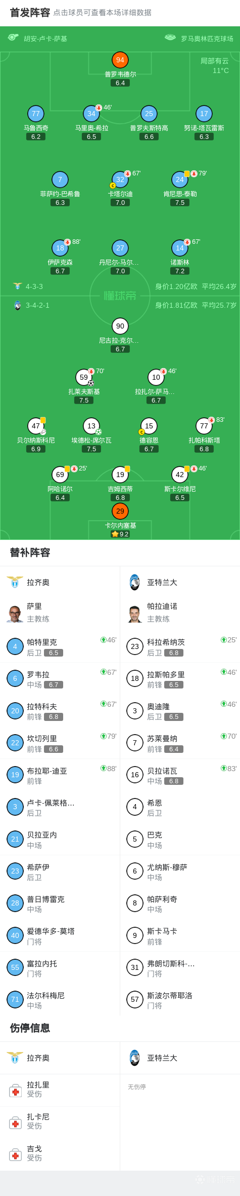 第42分钟,卡塔尔迪手球送点,席尔瓦点射破门,拉齐奥0-1亚特兰大
