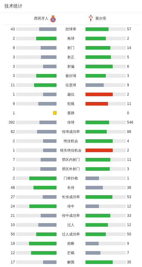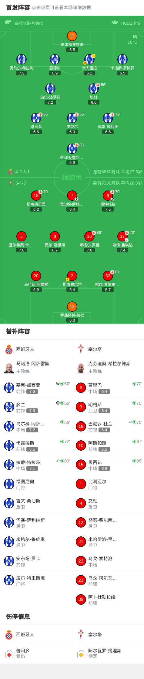 北京时间2月14日西班牙足球甲级联赛 联赛 第24轮,西班牙人主场对阵塞尔塔。西班牙人基克-加西亚破门,多兰破门。塞尔塔胡特格拉破门,博尔哈-伊格莱西亚斯破门。最终比分西班牙人 2-2 塞尔塔。