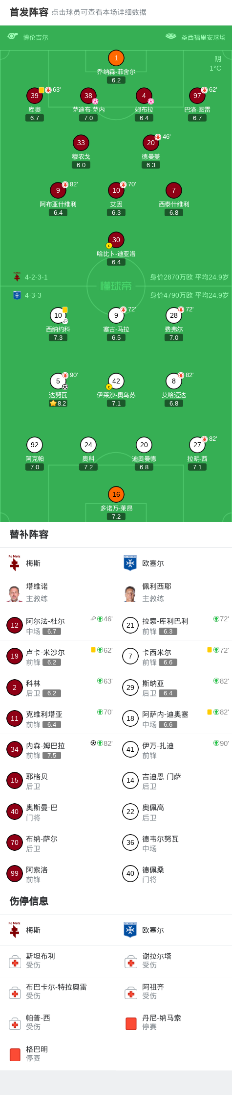 下半场补时第4分钟,梅斯球员阿尔法-杜尔助攻内森-姆巴拉打入一球。