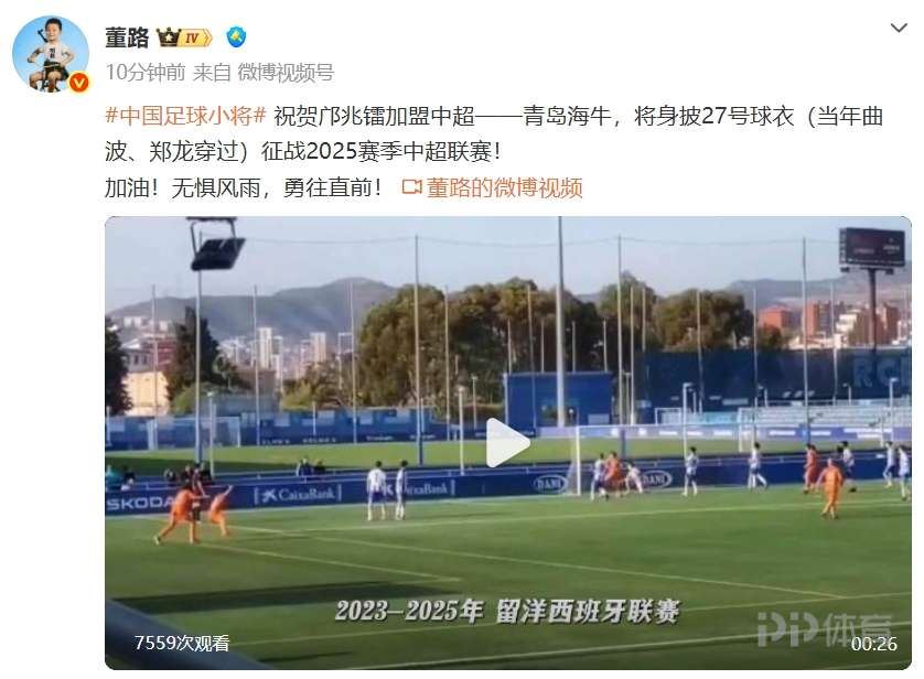 董路写道:“祝贺邝兆镭加盟中超——青岛海牛,将身披27号球衣(当年曲波、郑龙穿过)征战2026赛季中超联赛!