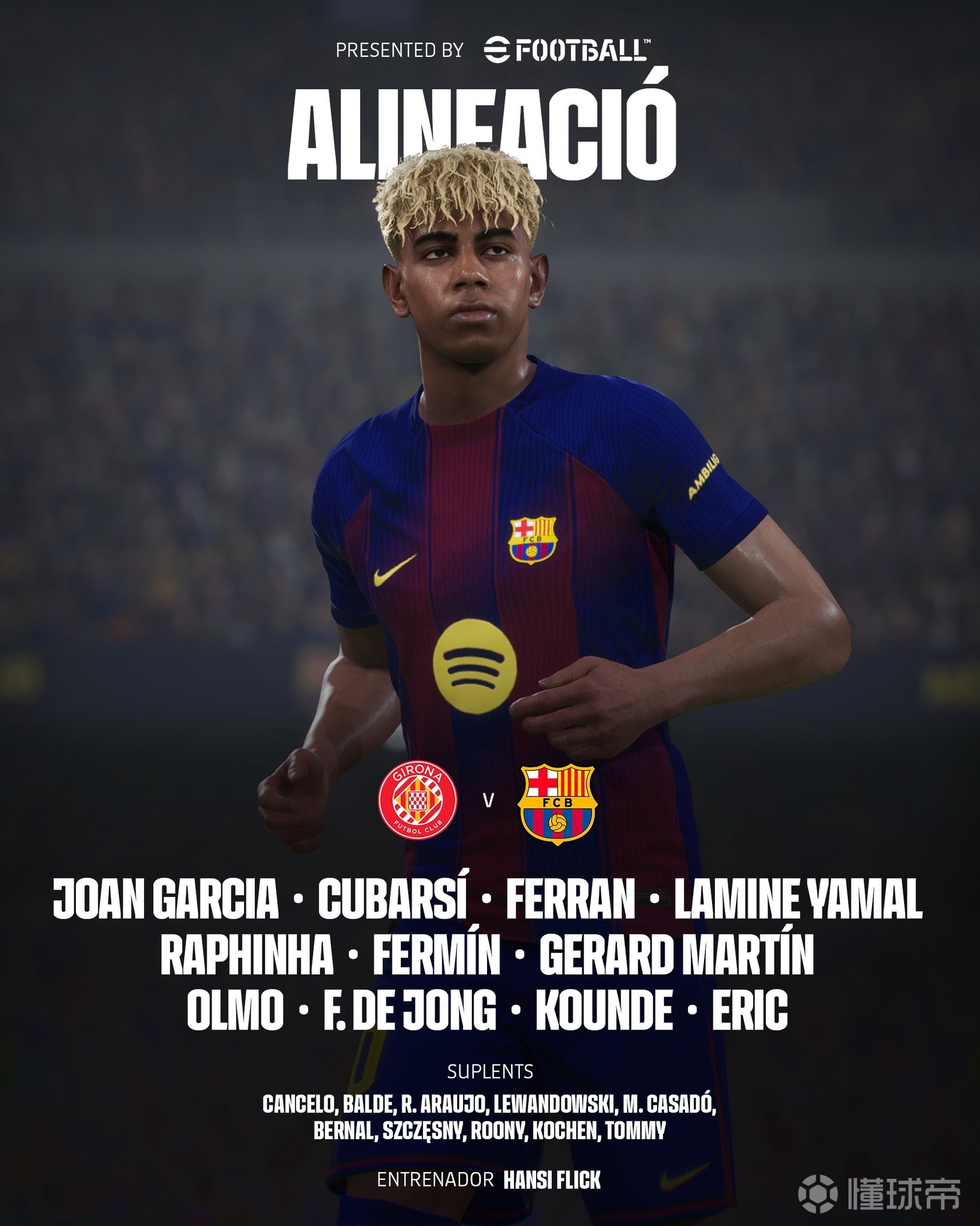 巴塞罗那首发:13-霍安-加西亚、23-孔德、18-赫拉德-马丁、5-库巴西、24-埃里克-加西亚、16-费尔明-洛佩斯、21-弗朗基-德容、20-奥尔莫、11-拉菲尼亚、10-亚马尔、7-费兰-托雷斯