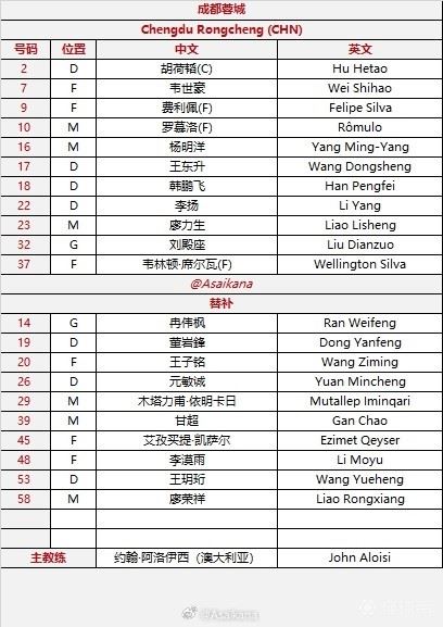 成都蓉城首发:32-刘殿座、2-胡荷韬、22-李扬、17-王东升、18-韩鹏飞、23-廖力生、10-罗慕洛、16-杨明洋、7-韦世豪、9-费利佩、37-韦林顿-席尔瓦