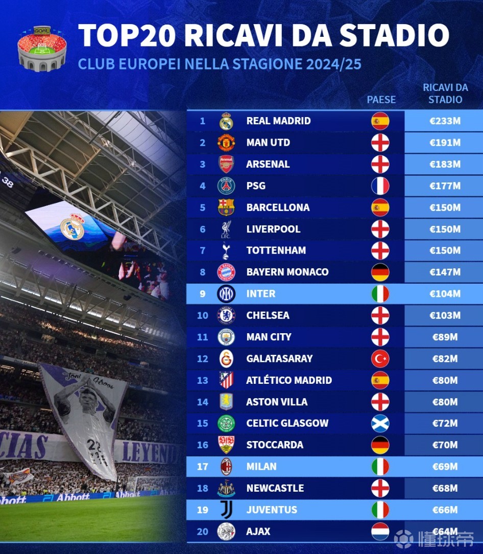 北京时间2月17日,德转统计出2024-25赛季欧洲球场门票收入最高的20家俱乐部,皇家马德里以2.33亿欧元高居第一,曼联1.91亿欧元第二,阿森纳1.83亿欧元第三。
