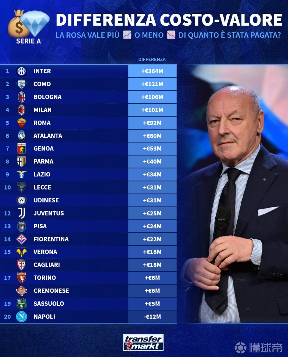 北京时间2月17日,德转统计出了意甲20支球队构建阵容的成本与现有价值的差价排行榜,国际米兰以增长3.64亿欧元高居第一,那不勒斯则是唯一负增长的球队,排名垫底。