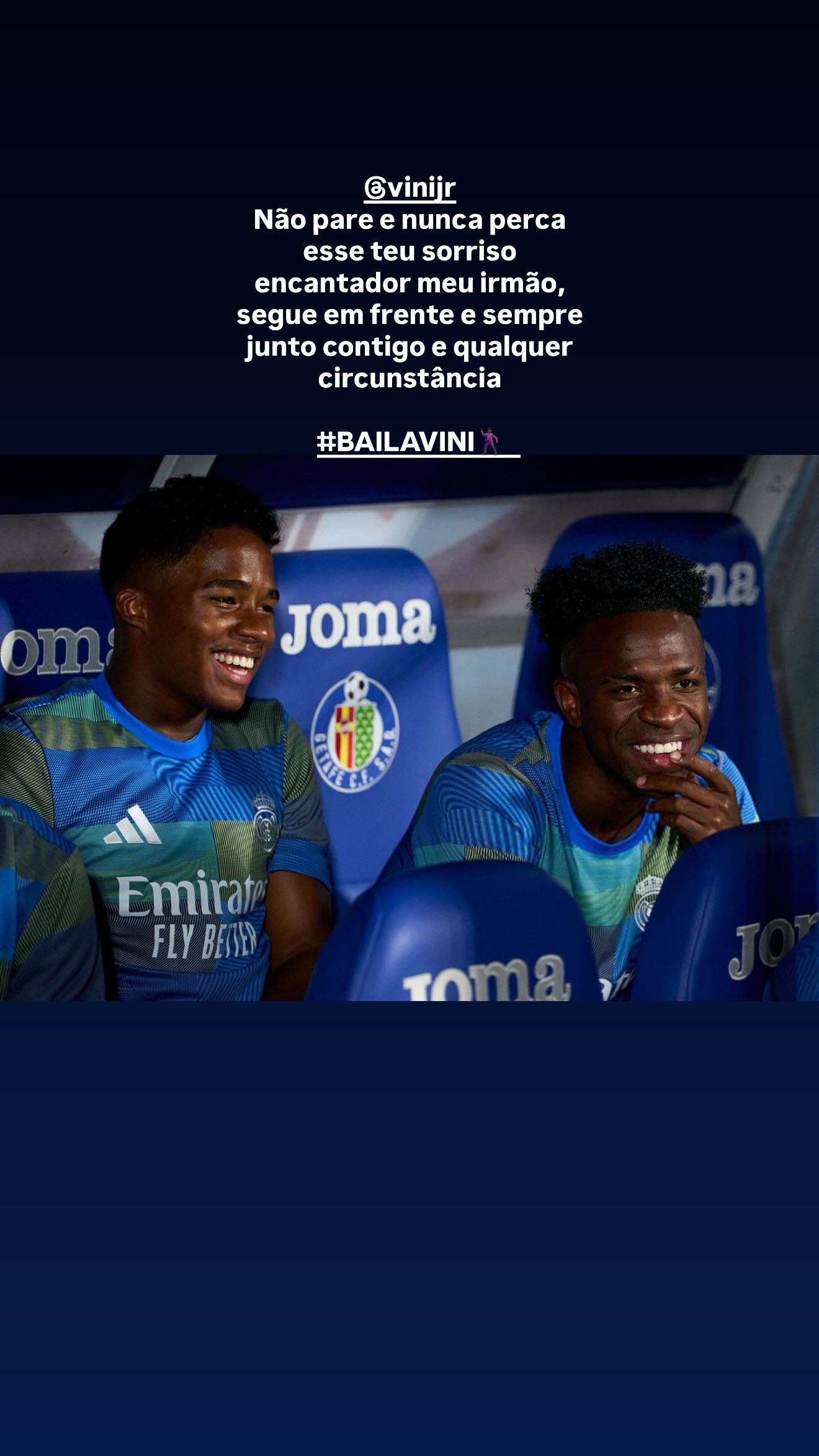 恩德里克晒出合照并圈了维尼修斯写道:“不要停下,永远不要失去你那迷人的笑容,我的兄弟。勇往直前,无论在什么境遇下,我永远与你同在。”