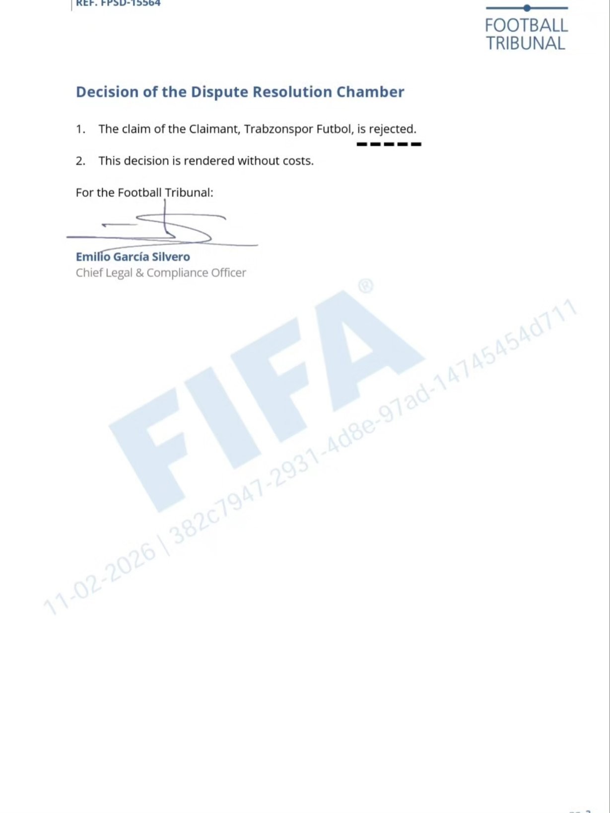 “国际足联最终做出了裁决,驳回了特拉布宗体育的诉求。因为在国际足联看来,我的行为是完全合法的,他们无法胜诉。”