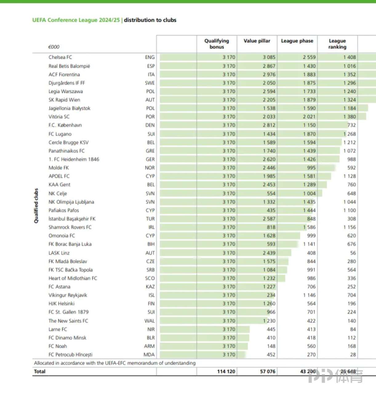 • 欧协联总奖金:冠军切尔西2182万欧,贝蒂斯1708万
