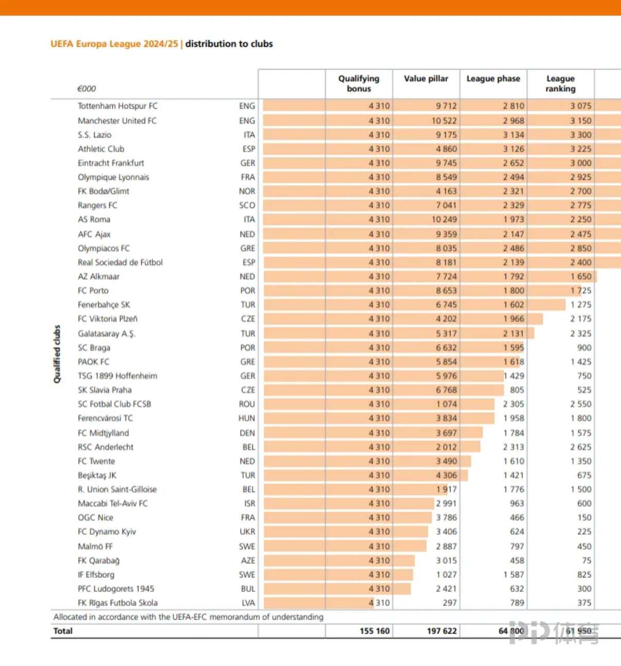 • 欧联总奖金:冠军热刺获4136万欧,曼联3640万欧