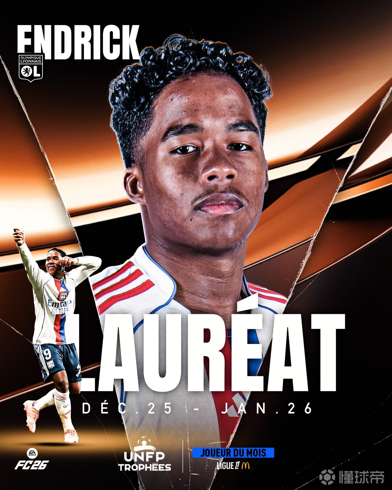 • 2场3球1助攻,恩德里克当选法甲1月最佳球员
