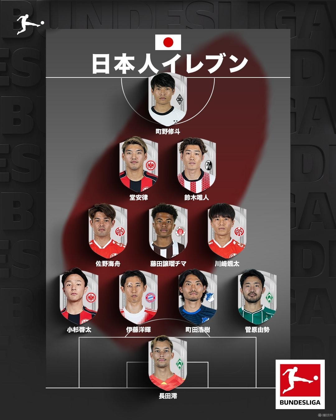 • 够一套首发,德甲官方日语账号分享德甲日本球员阵容