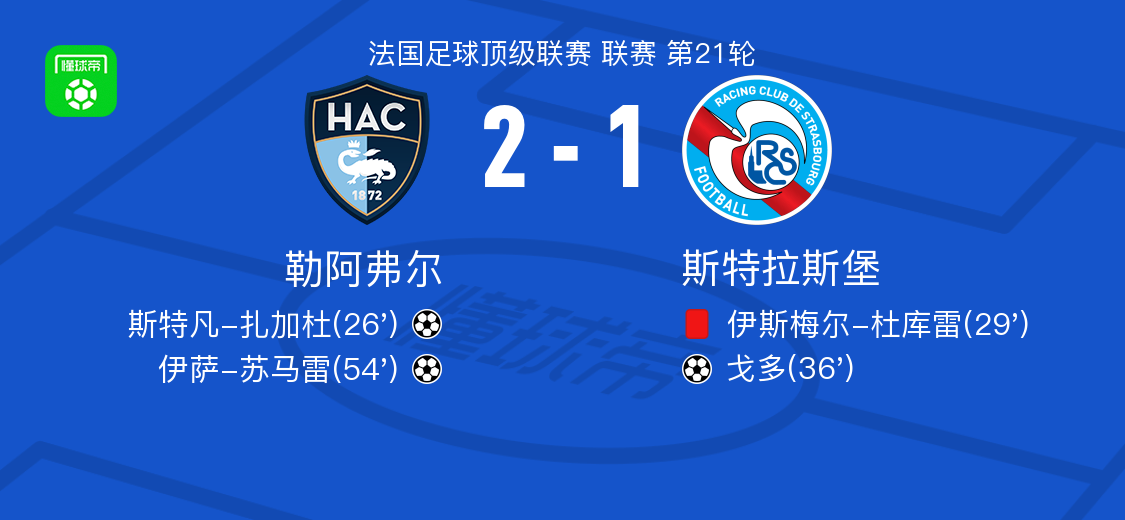 • 勒阿弗尔2-1斯特拉斯堡,伊萨-苏马雷建功,斯特凡-扎加杜破门