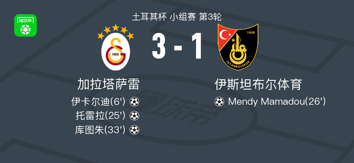 • 加拉塔萨雷3-1伊斯坦堡士邦,库图朱、托雷拉破门
