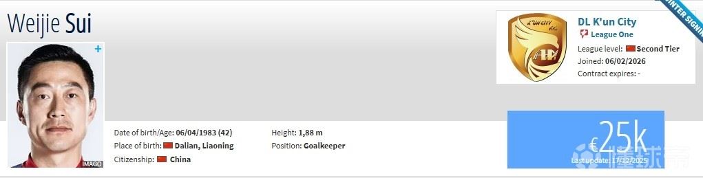 • 德转:42岁原大连英博门将隋维杰加盟大连鲲城