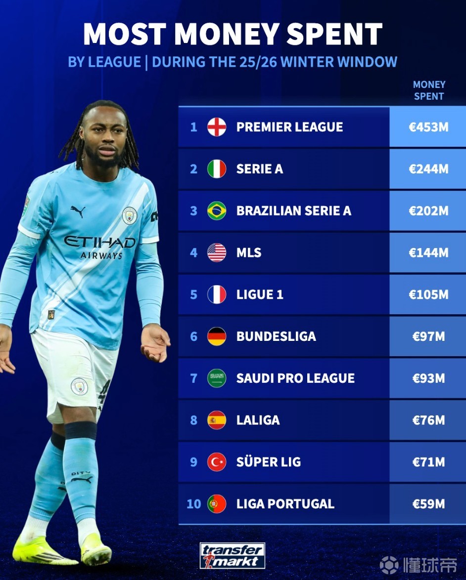 • 德转列2026年冬窗联赛支出榜:英超4.53亿欧断档第1,意甲第2