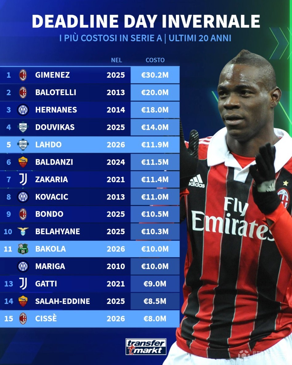 • 06年以来意甲冬窗截止日最贵交易:米兰3020万欧签圣地亚哥第1