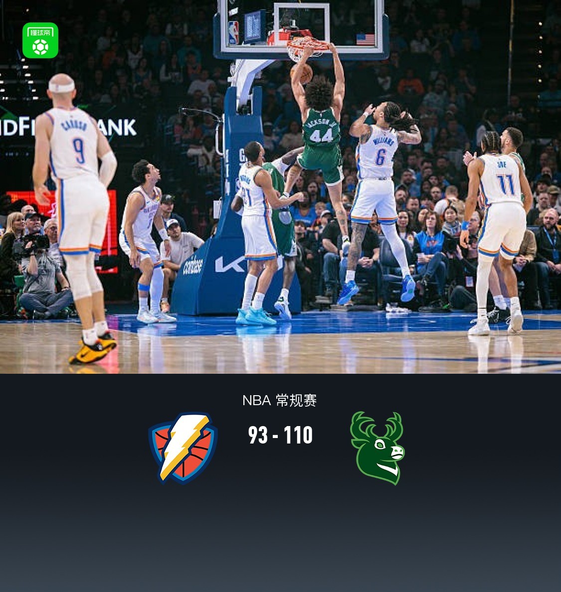 • 雄鹿110-93大胜雷霆,迪昂19+11+6+4帽弑旧主,霍姆格伦16+13