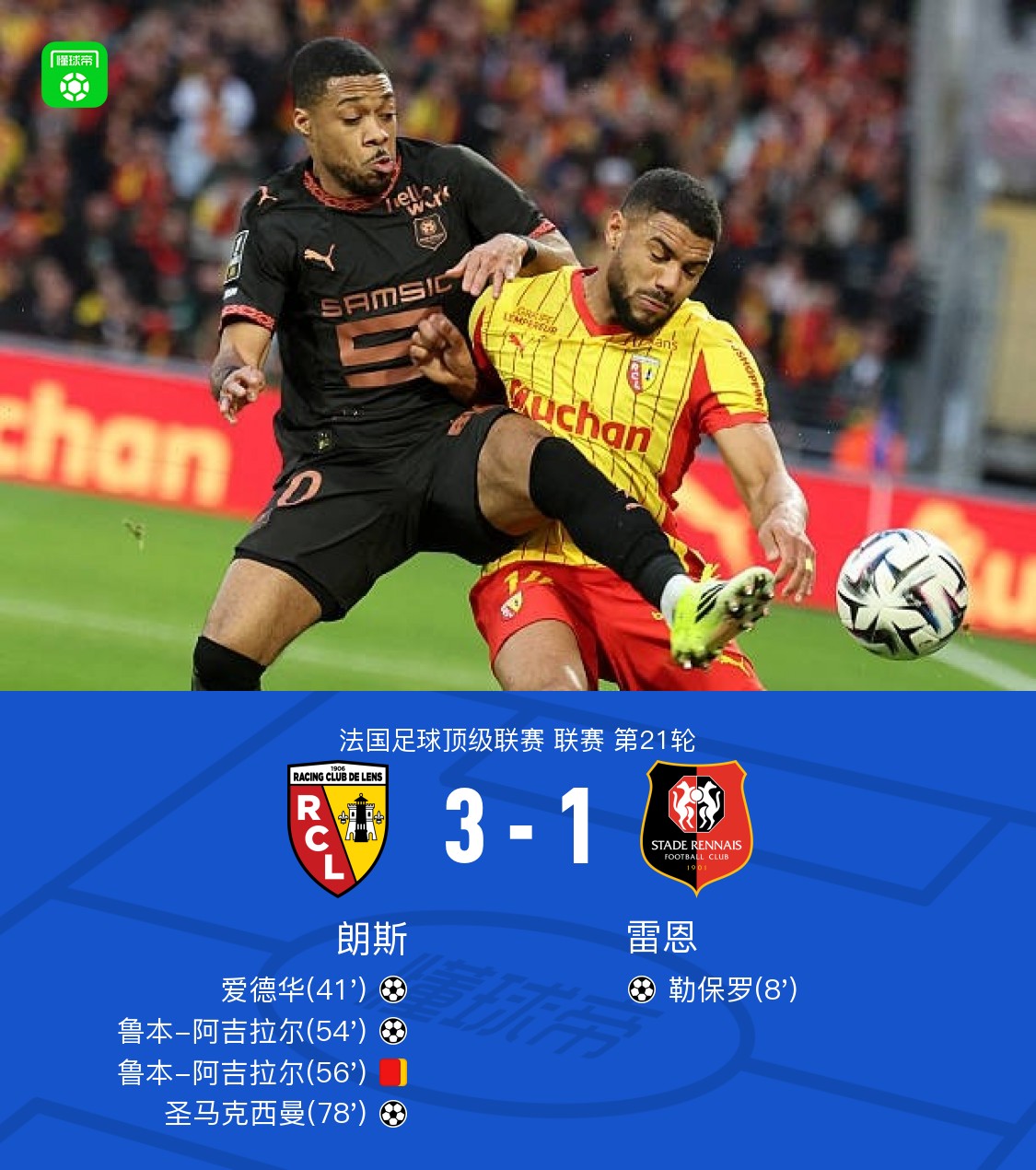 • 十人朗斯3-1雷恩,鲁本-阿吉拉尔传射+染红,圣马克西曼建功